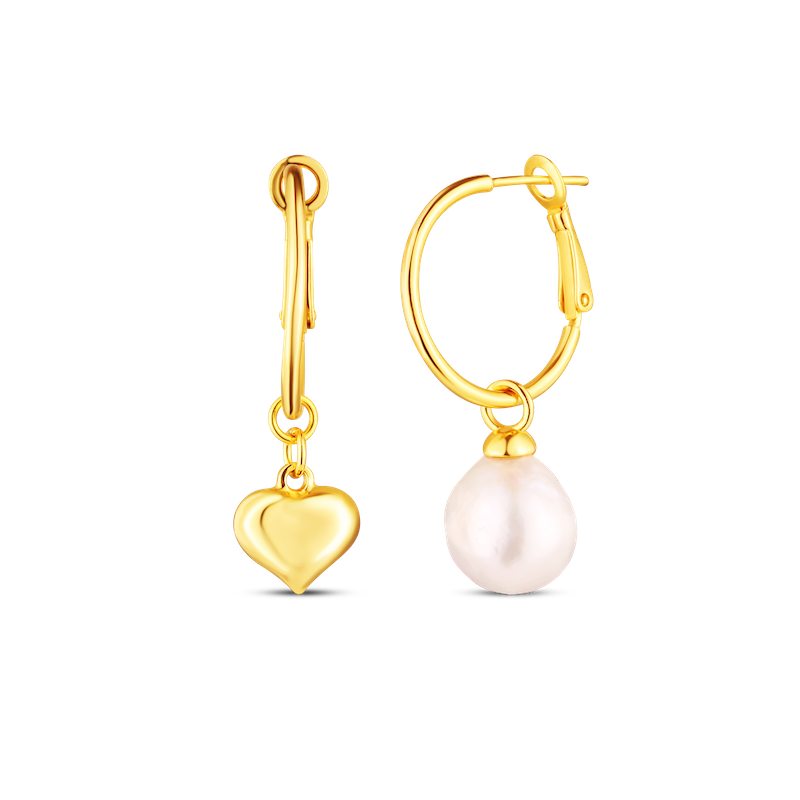 Jedna náušnice je zdobena sladkovodní perlou s jemným leskem, která vyzařuje přirozenou eleganci, zatímco druhá nese minimalistické zlaté srdce, symbol lásky a něžnosti.